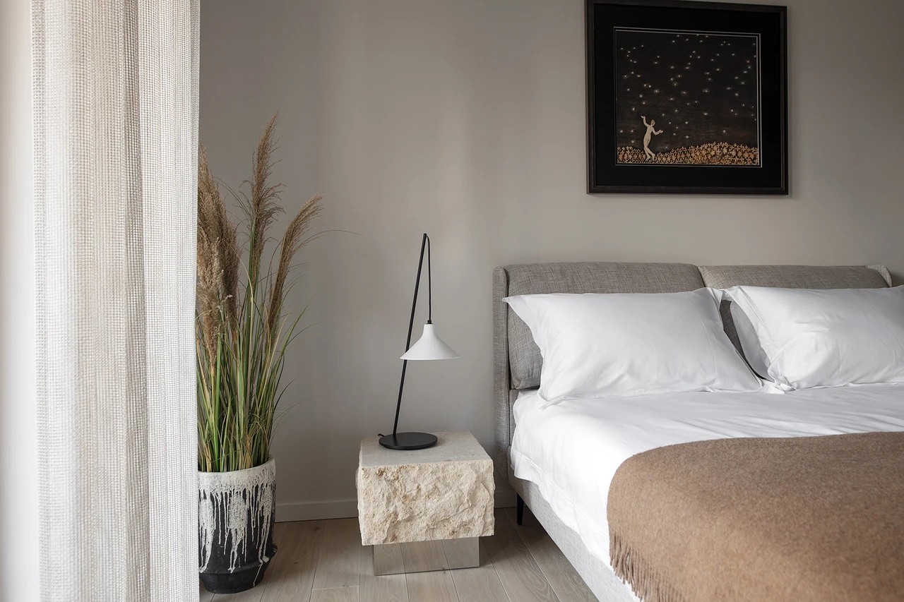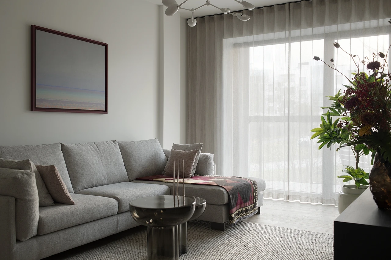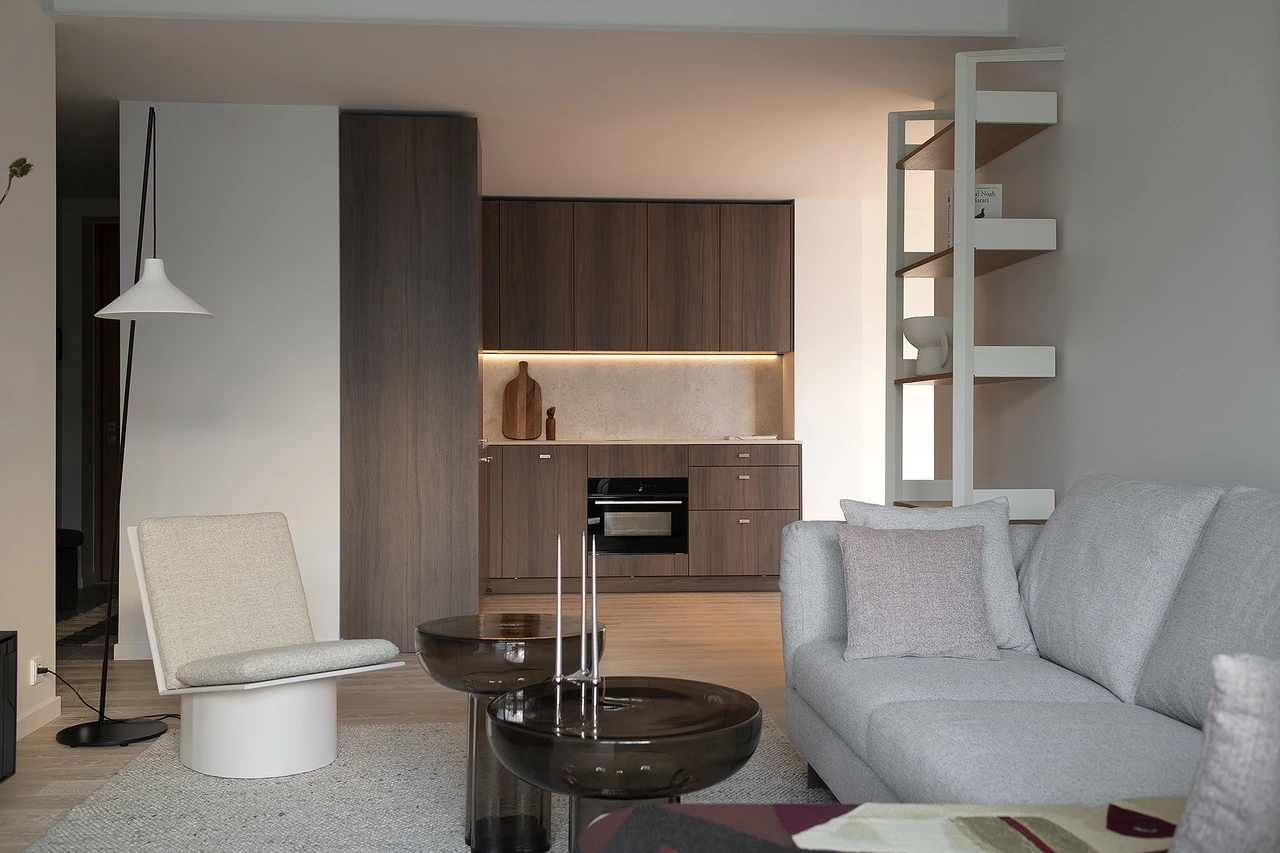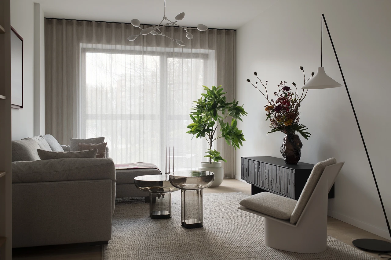 A city home with a calming, French sensibility. The furniture and lightings are sophisticated with a nature loving touch and the rooms given character with light tones and a bit rough structures. Retro-like forms are used as well as chrome details, which give a modern-urban touch.